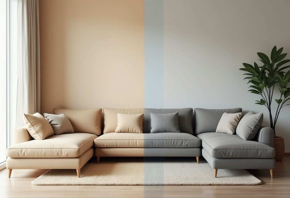 - Ambiance générale : un espace avec un canapé beige paraît souvent plus accueillant et intime, alors qu’un canapé gris donne une impression d’élégance et de rigueur.